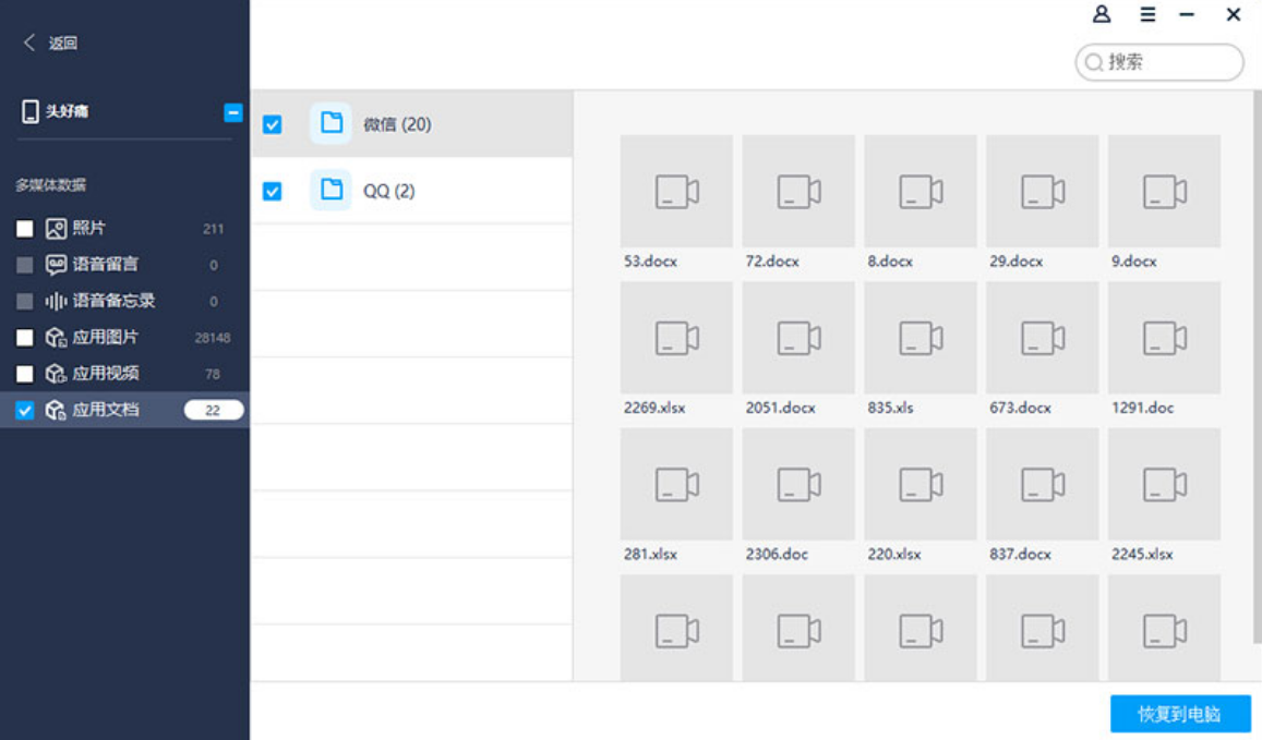 3、勾選要恢復的數據,點擊“恢復到電腦”。即可恢復數據。
