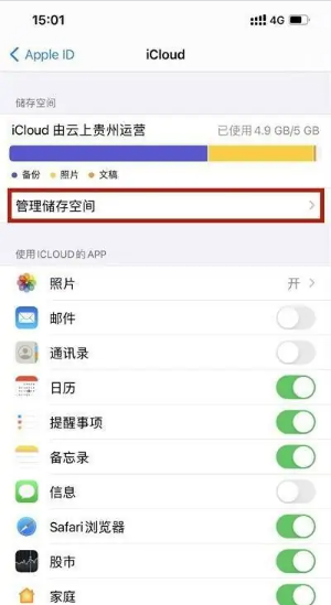 3、然后在iCloud的界面里,點擊管理儲存空間。