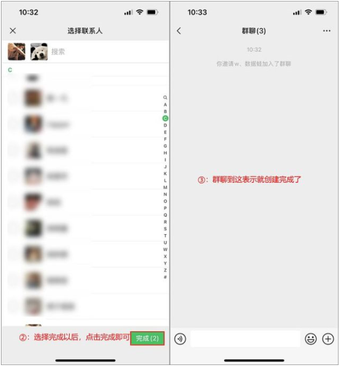 2、然后在新窗口中找到需要建群的【對象】,勾選后點擊右下角的【完成】即可建群。
