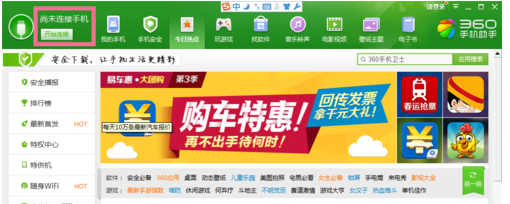 1、首先在自己的電腦上也安裝好360手機助手客戶端軟件,點擊左上角的開始連接。