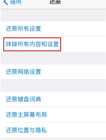 2、在通用界面下點擊還原,選擇還原里面的“抹掉所有 內容和設置”即可。