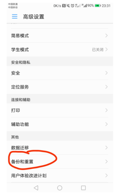1、在我們打開手機設置,在高級選項中單擊備份和重置;