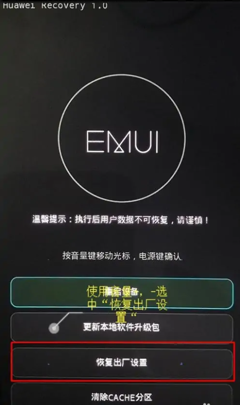 2、接著使用音量+,-鍵來移動光標,選中“恢復出廠設置”(注意:恢復出廠設置期間將會格式化系統,請謹慎選擇操作),接著按電源鍵確定即可開始執行重置系統操作。