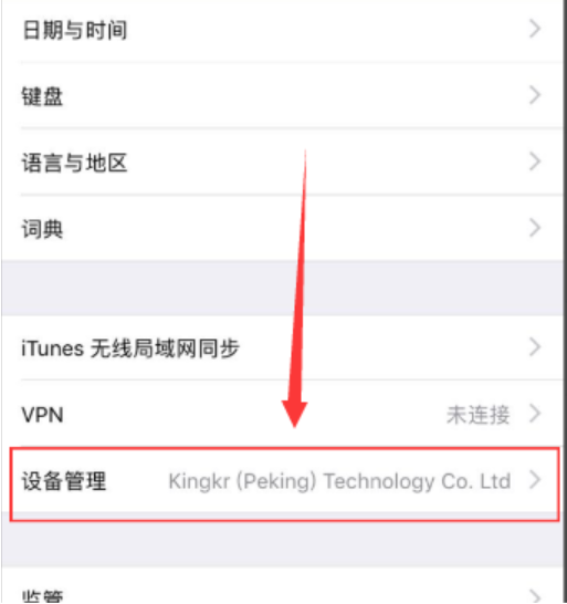 5、點擊進入設備管理,查詢剛剛提示未受信任的企業級開發者前綴。點擊進入其中。