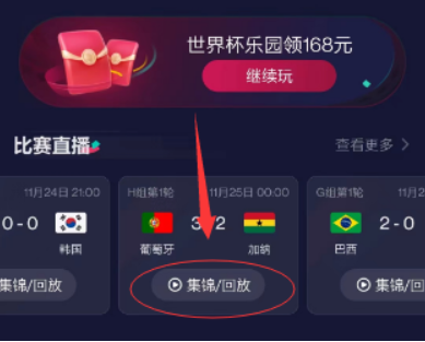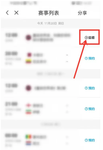 3、進入賽程界面后,這樣就可以選擇賽事,點擊比賽右側“回看”按鈕觀看卡塔爾世界杯回放內容。