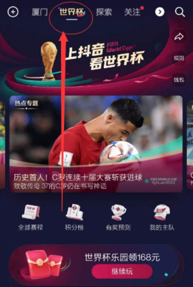 1、同樣手機安裝好抖音后打開,進入主頁后選擇頂部的世界杯進入。