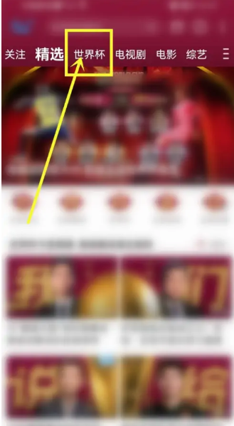 1、首先在手機上安裝并打開咪咕視頻app首頁,點擊頂部“世界杯”頻道進入。