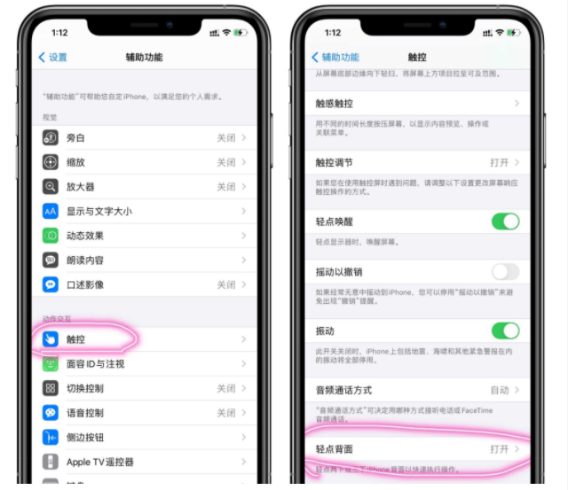 1、依次點擊手機設置-輔助功能-觸控-輕點背面。