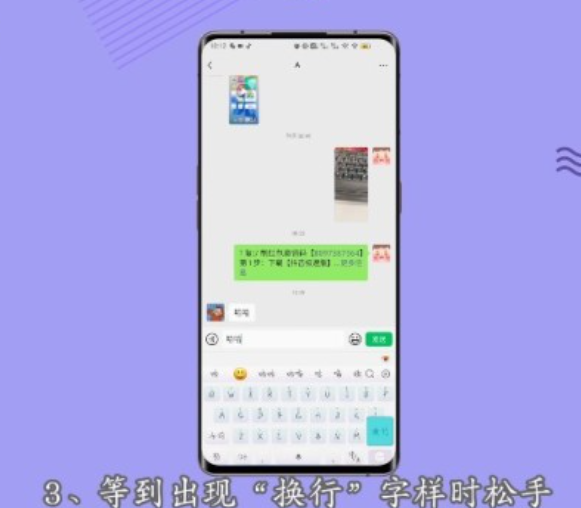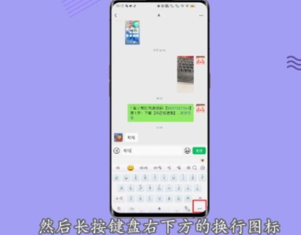 2、輸入文字后長按鍵盤右下方的換行圖標。