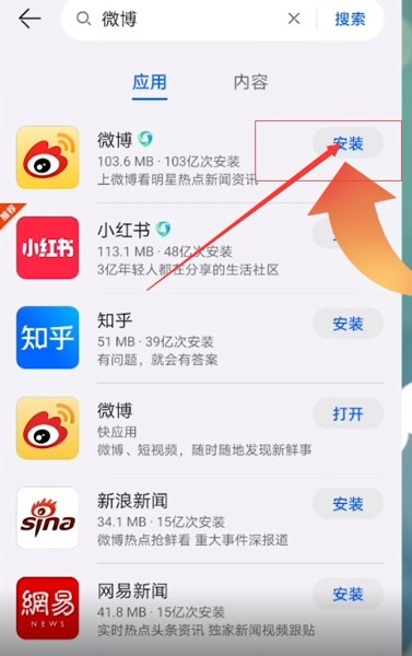2、在搜索框內輸入【微博】,在顯示結果之中,點擊安裝即可成功下載微博。