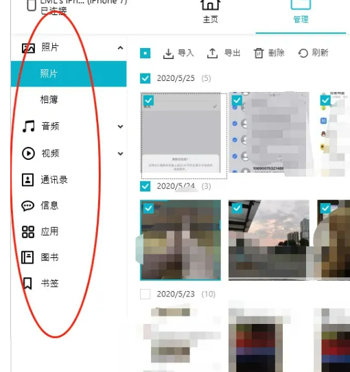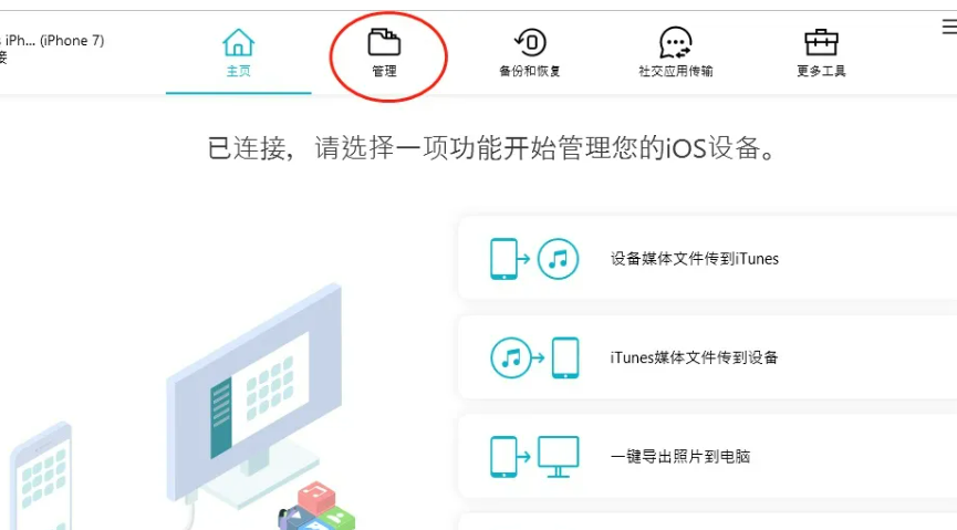 1、下載牛學長蘋果數據管理工具,使用USB數據線連接手機和電腦,選擇文件“管理”功能。
