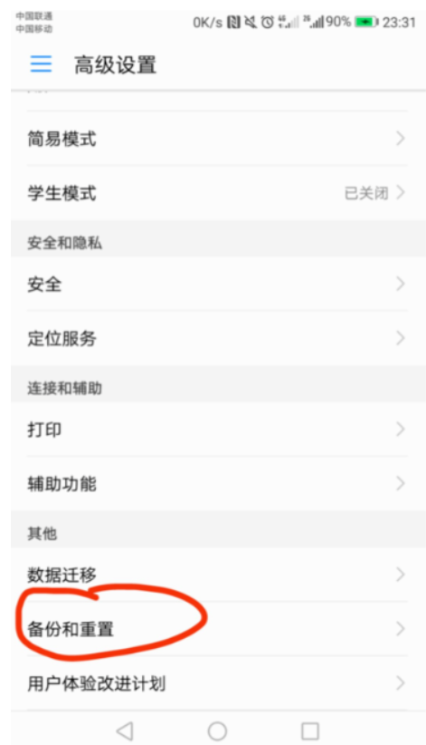 1、首先打開手機設置,在高級選項下點擊備份和重置;