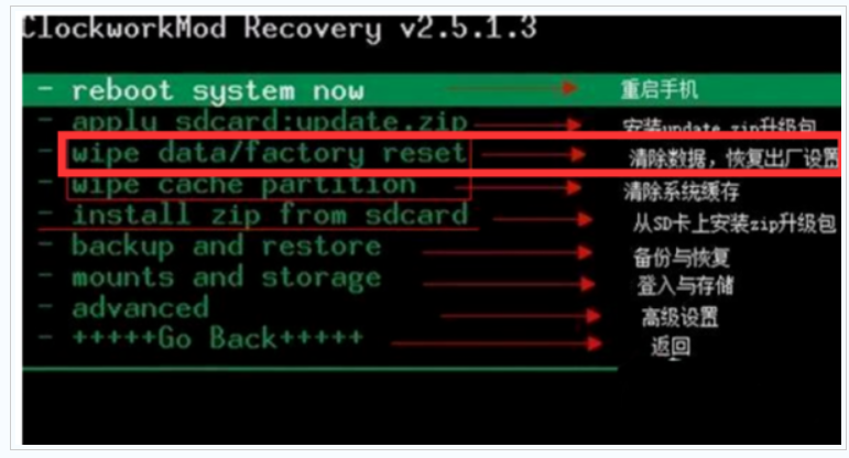 1、將手機處于關機狀態,按住音量下+電源鍵開機,進入Recovery模式;