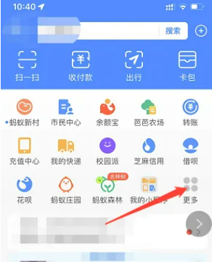 1、打開支付寶,在首頁應用中心中找到更多圖標,點擊進入下一步。