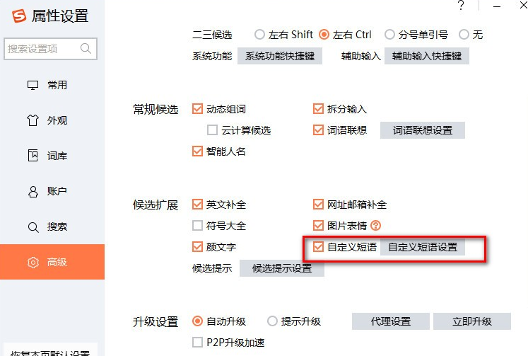 4、進入高級設置頁面,找到自定義短語設置,點擊進去就可以設置自己想要設置的固定語句了。