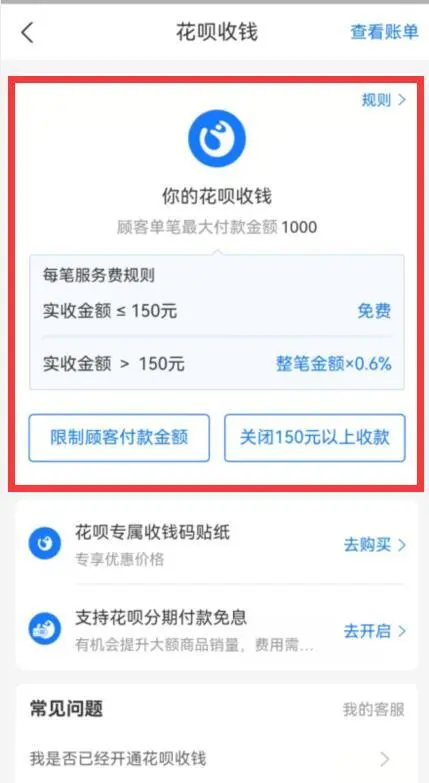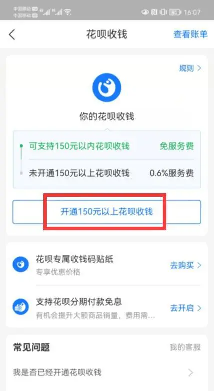 3、進入花唄收錢,點擊開通150元以上花唄收錢。