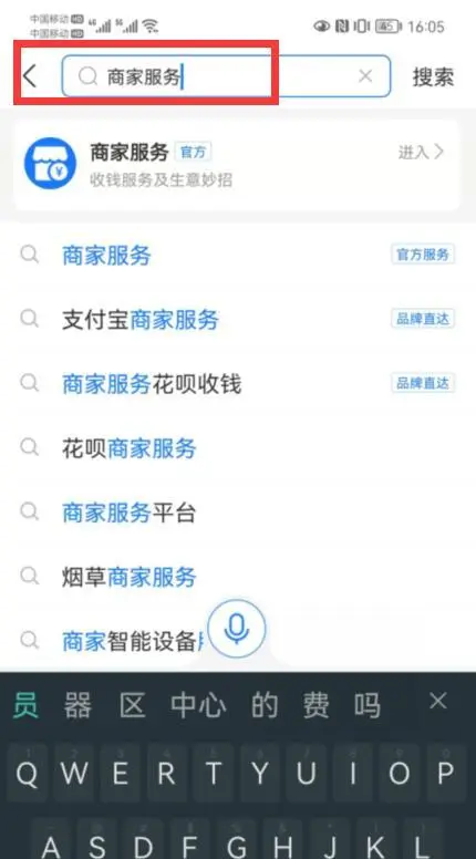 1、打開支付寶首頁,點擊搜索框,搜索商家服務。