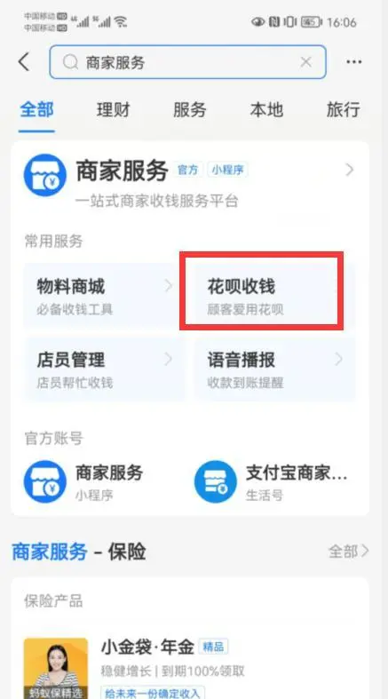 3、在【商家服務】頁面,找到并點擊【花唄收錢】。