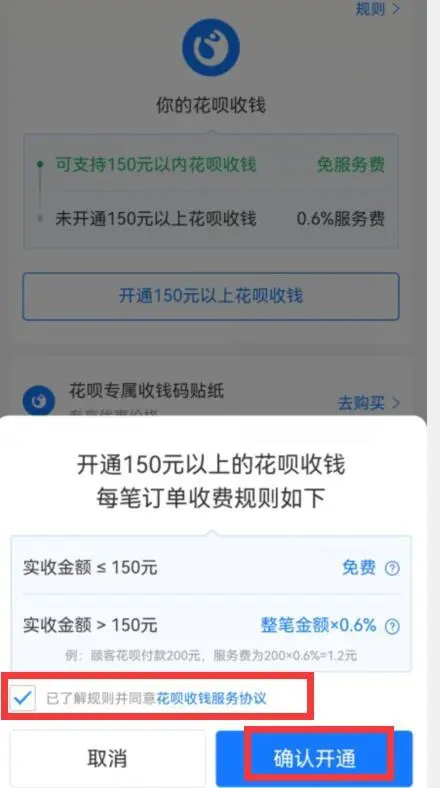 4、勾選統一花唄收錢服務協議,點擊確認開通。