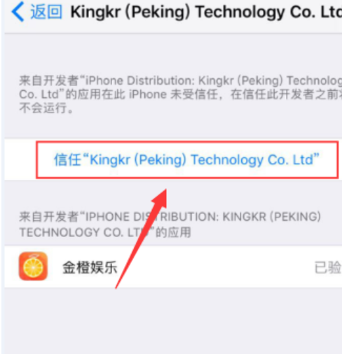 2、點擊打開發現顯示未受信任的企業級開發者,提示未受信任的企業級開發者為:kingkr(peking)Technology CO. Ltd,此為該應用開發者信息即可。