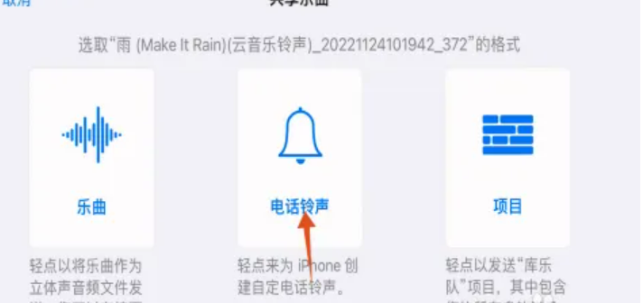 3、點擊完成之后會彈出一個功能菜單,點擊庫樂隊,將音樂拷貝到庫樂隊。保存的音樂,在彈出的序列欄中點擊共享。翻轉到共享樂曲的頁面之后,在頁面中點擊電話鈴聲這個選項進入。
