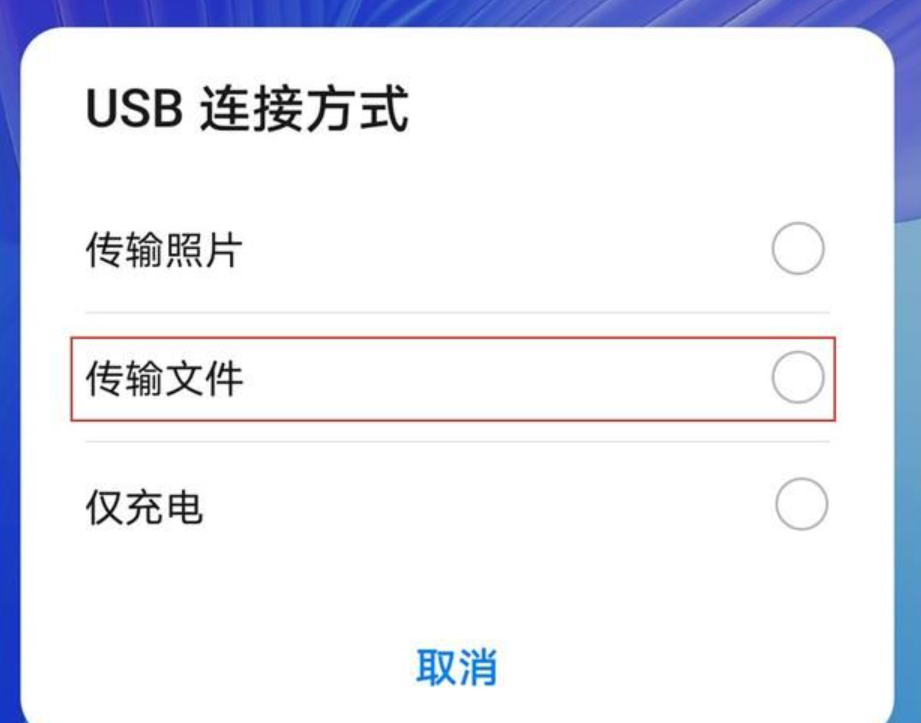 (2)連接后,手機屏幕上出現三種USB連接方式,選擇傳輸文件作為目的。