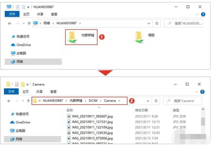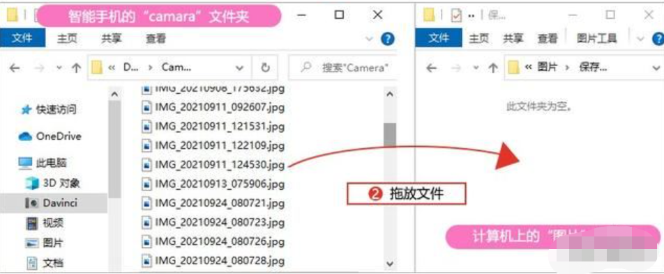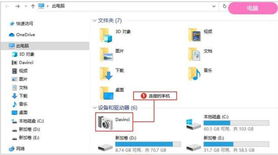 (3)資源管理器中打開“此電腦”時,會顯示通過USB數據線連接的手機(①)。就像外部存儲一樣,打開一個文件夾,通過拖放(②)的方式將照片等復制到計算機上。