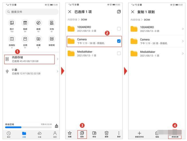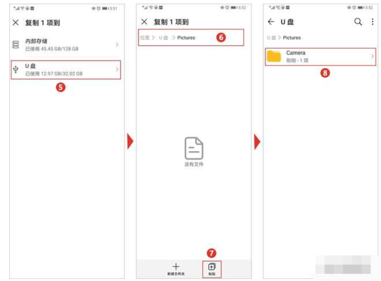 (3)打開手機上的“文件管理”或類似應用,選擇“內部存儲”(①), 并長按要復制的文件夾或文件(②),可以選擇多項。從底部菜單 (③) 點選“復制”, 然后指定復制目的地。打開底部菜單的其他位置(④),選擇目標U盤(⑤),指定U盤中的目標文件夾(⑥),執行“粘貼”(⑦)。也可以利用“移動”功能來完成傳輸。從U盤到手機也是類似的操作。