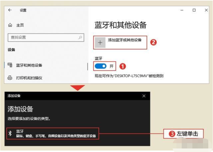 (2)打開電腦上的藍牙功能。選擇“開始” > “設置” >“設備”>“藍牙和其他設備”, 然后打開“藍牙”并單擊“添加藍牙或其他設備”,“添加設備”窗口選擇“藍牙”。