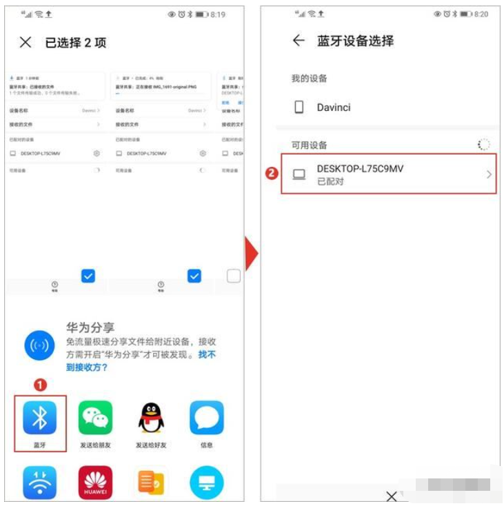 (2)在手機上選擇將發送到計算機的文件。點擊“分享”圖標并從出現的菜單中選擇“藍牙”,然后選擇配對的計算機。收到后,可以指定要保存的文件夾。