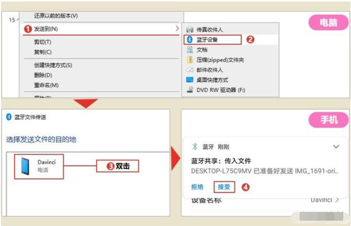 右鍵單擊要發送的文件,從菜單中選擇“發送到”->“藍牙設備”。雙擊目標手機,當通知顯示在手機上時,點擊“接受”。該文件將被傳輸,并存儲在手機的“藍牙”文件夾中。如果使用“文件管理”應用打開此文件夾,將會看到收到的文件。[提示:如果藍牙連接不穩定,請安裝制造商提供的藍牙驅動程序。]