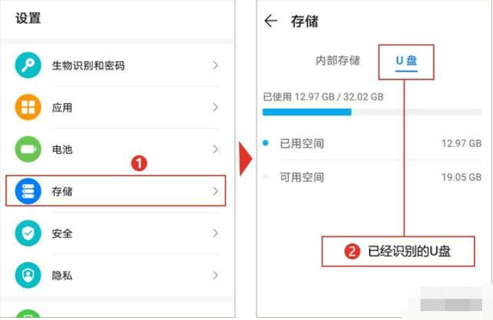 (2)連接后,可以通過進入"設置 "中的 "存儲 "來檢查U盤是否被正確識別(①)。 如果它被識別,將顯示為U盤(②)。