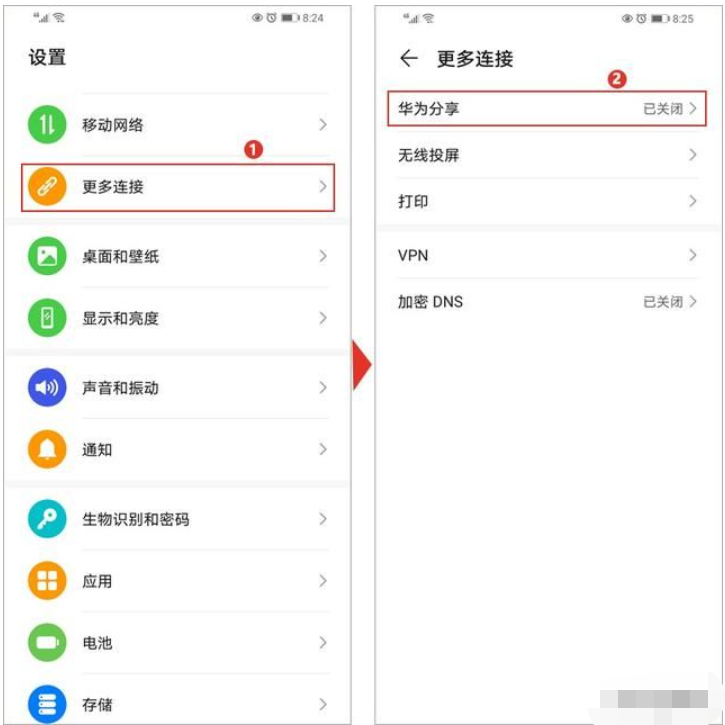 (1)在手機上,進入“設置” > “更多連接” > “華為分享” ,開啟華為分享和共享至電腦開關。