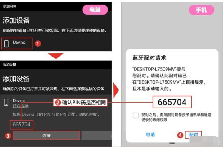 (3)選擇要連接的手機名,電腦和手機屏幕上會顯示PIN碼。確認電腦和手機的 PIN 碼相同,然后進行配對。