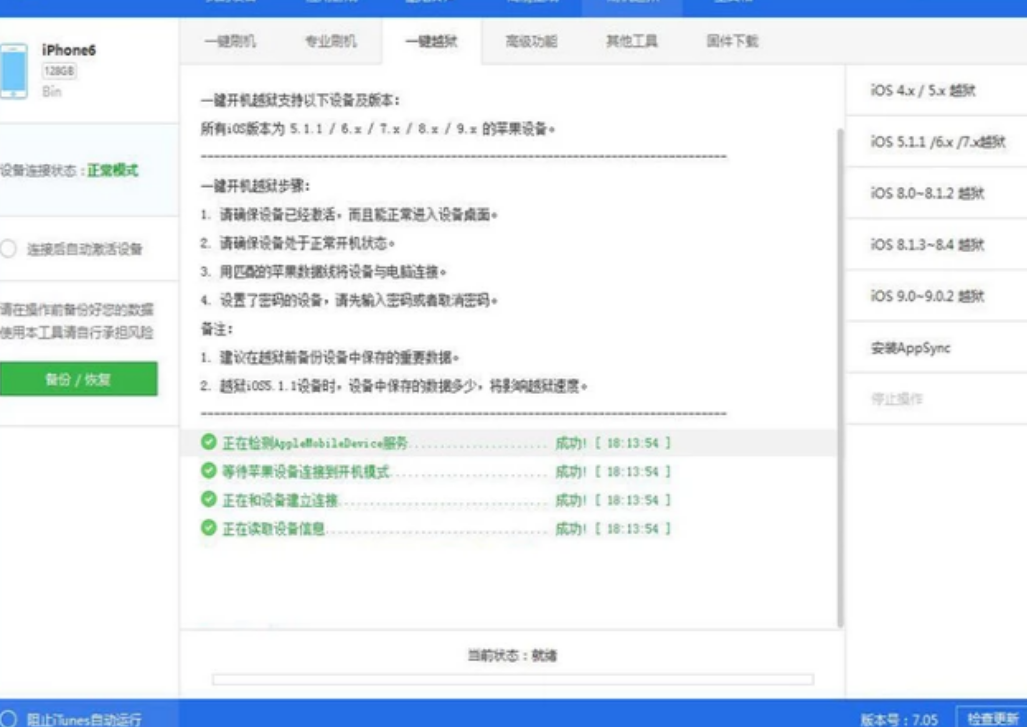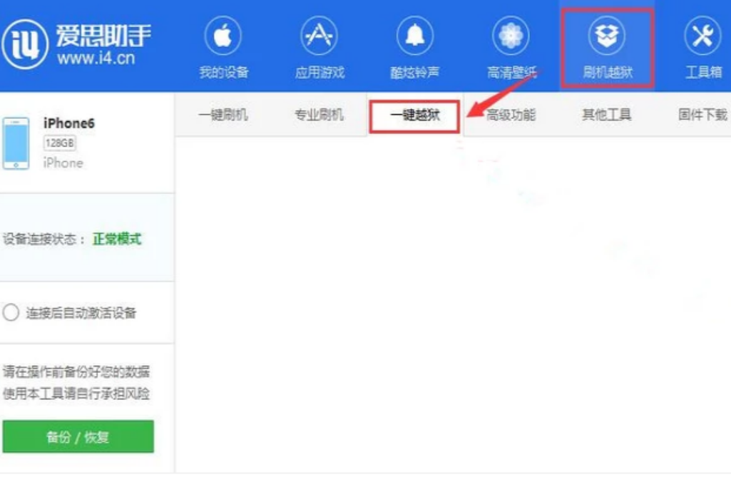 4、打開愛思助手的電腦端,將蘋果手機與電腦連接,點擊刷機越獄,一鍵越獄;