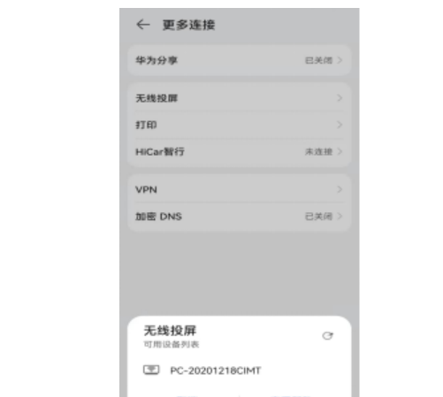 4、打開手機,進入設置界面,點擊更多連接,選擇無線投屏,打開無線投屏,在列表的無線投屏設備名單選擇要顯示的電腦名字。