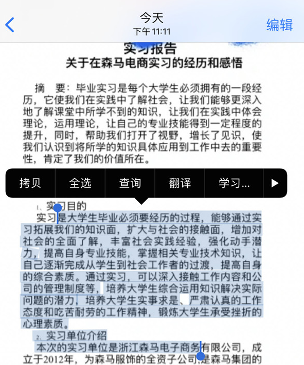 2、此時,這一窗口中的所有文字內容都能夠被直接選取從而進行后續的復制、分享、查詢乃至翻譯等操作作。
