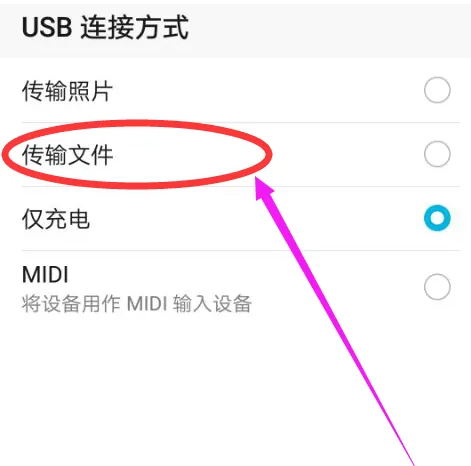 2、然后在打開的"USB連接方式"頁面里面,點擊“傳輸文件”選項。