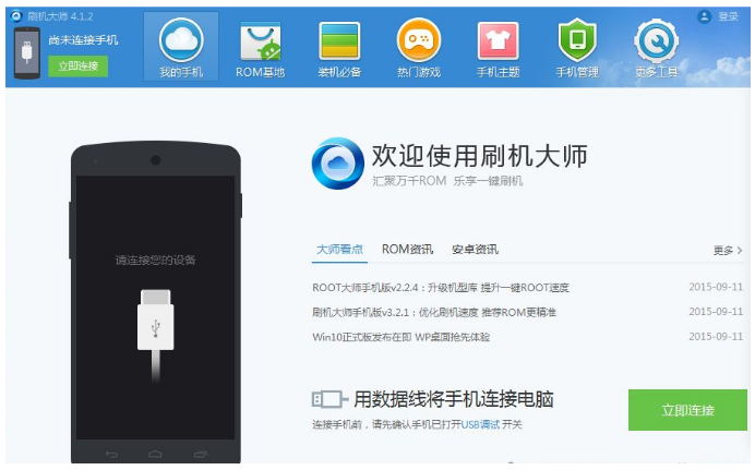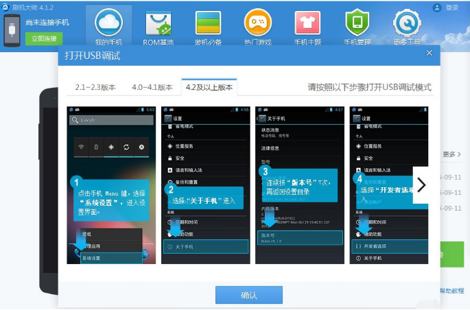 2、通過數據線將手機連接到電腦,在手機設置中找到USB調試開啟,這樣才能連接到刷機大師工具。