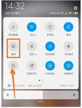 1、首先下拉頂部屏幕找到控制面板,打開手機的截屏功能,對屏幕進行正?!敖仄痢?。