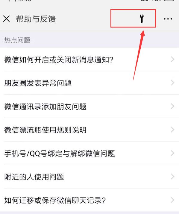 2、進入到幫助與反饋界面后,選擇右上角的扳手圖標。