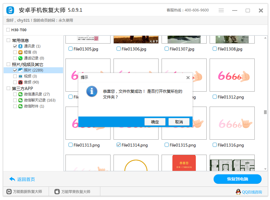5、掃描完成后,可以看到界面上已經掃描出來了很多照片,找到自己要的照片,先勾選,再點擊“恢復到電腦上”,設置保存路徑,看到恢復成功即可。