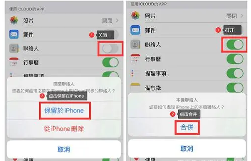 4、點擊聯系人綠色的圖標,關閉聯系人,接著點擊保留在iPhone,再打開聯系人綠色圖標,點擊合并,最后去查看通訊錄里的聯系人有沒有恢復到。
