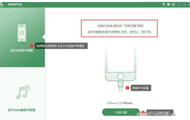 1、在電腦上安裝蘋果恢復專家,連接手機到電腦上,點擊“開始掃描”。