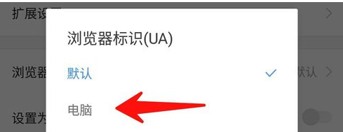 5.之后會彈出一個瀏覽器ua設置的窗口,在該窗口默認顯示為移動版(即為這里的默認),除此之外還有兩個ua設置選項,你只需要選擇“電腦”點擊即可。這里ua是指的頁面設置。