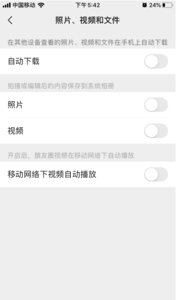 微信:打開微信-“我”-“設置”-“通用”-“照片、視頻和文件”-取消“自動下載”