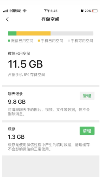 選擇“清除緩存”可能會清除比較重要的文件,大家也可以通過“管理聊天數據”來刪除特定的不需要的聊天緩存文件。
