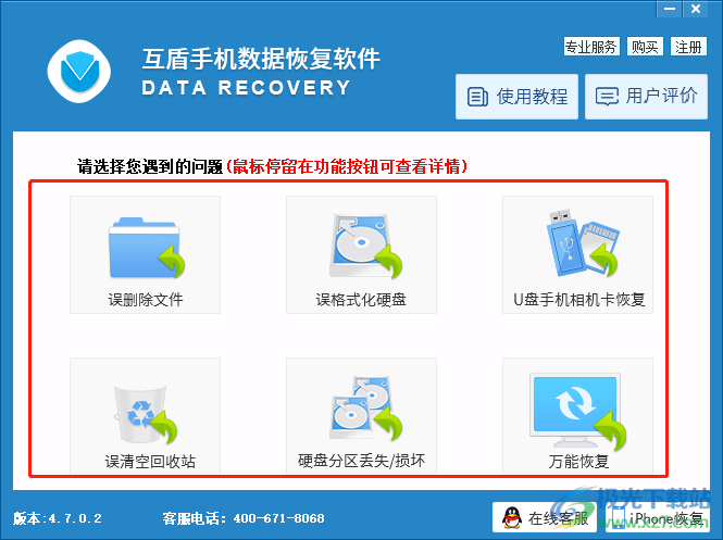 1.互盾手機數據恢復軟件下載后怎么使用呢?首先我們可以將互盾手機數據恢復軟件雙擊打開,然后在打開的頁面中你可以看到該軟件頁面是一些功能選項,我們可以根據自己的需要進入到相應的功能選項中進行操作。