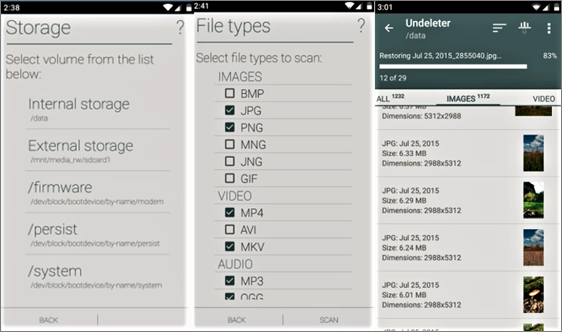 適用于 Root 用戶的 Undeleter是一款免費的 Android 恢復應用程序,可以用于臨時恢復丟失的數據,例如圖片、視頻、音樂、檔案、二進制文件以及存儲在 Android 內部存儲器和存儲卡上的所有其他文件。大家需要做的就是打開應用程序并選擇要掃描的內存或 SD 卡??梢詫@示已刪除文件的列表。