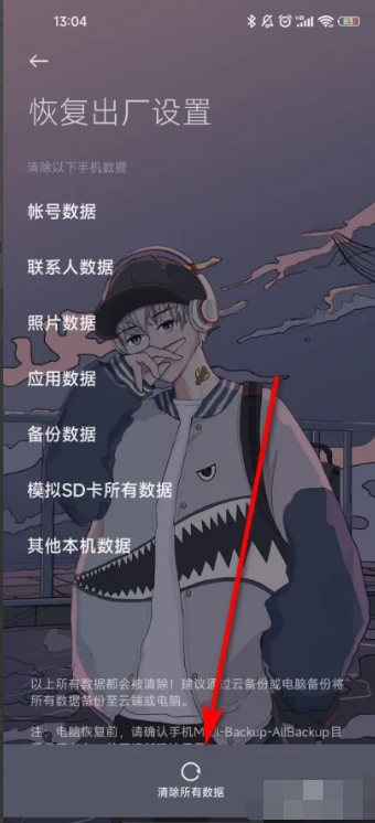 5、在恢復出廠設置界面點擊底部的清除所有數據,耐心等待數據刪除完畢重啟手機即可恢復出廠系統。